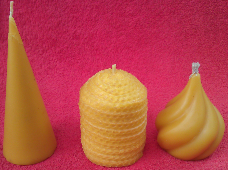 Verschiedene Kerzen aus reinem Bienenwachs. Die Kerzen aus unserem Sortiment werden aus reinem Bienenwachs auf vier verschiedene Arten hergestellt: gegossene, gezogene, gerollte und handgeknetete Kerzen.